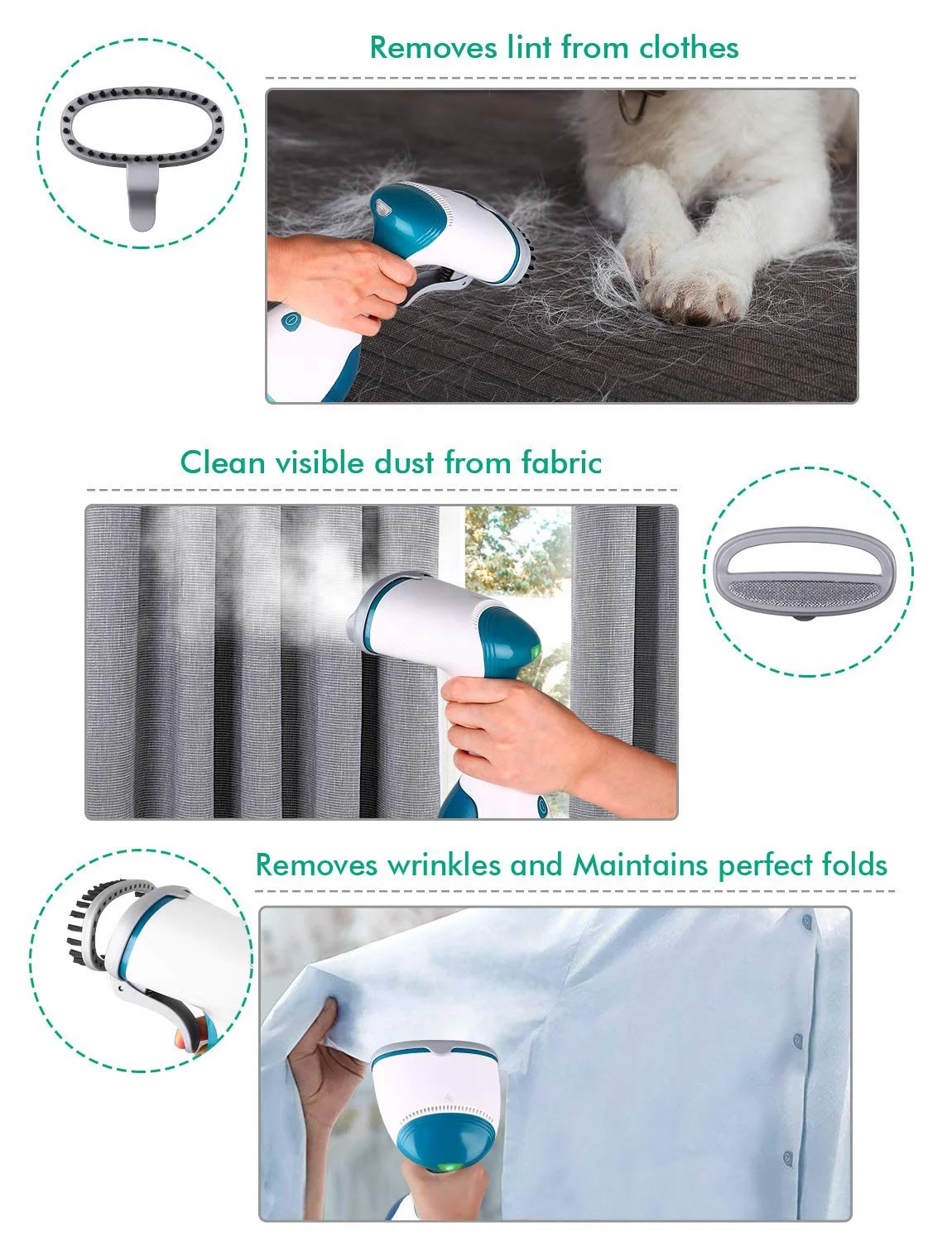 ✔ 5 in 1 MULTI-FUNCTIONAL STEAMERIroning. disinfection. humidification. wrinkle & dust removal. It works gently on even the most delicate fabrics and is suitable for all fabrics to kill bacteria and remove odors easily. You can freshen many items and are not only limited to clothes. Perfect for steam cleaning for carpets. curtains. bedding. cushions. sofa. kids toy and more. The package includes a perfect lint remover plus a refreshed brush makes it a versatile machine.
